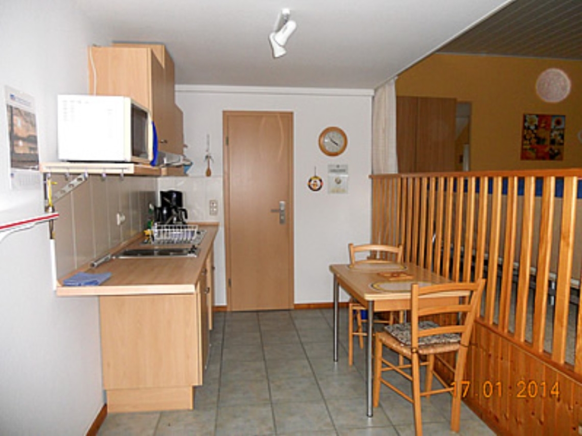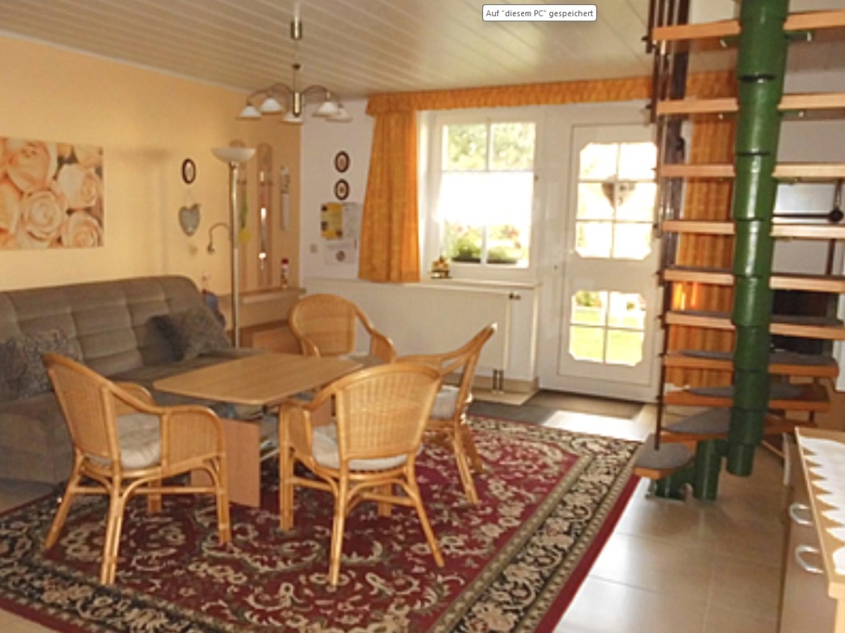 Der Wohnbereich ist liebevoll eingerichtet – mit gemütlicher Couch, Sesseln, TV, Radio und Bücherregal. Eine Essecke grenzt an die voll ausgestattete Küche mit Backofen, Mikrowelle, Kaffeemaschine, Wasserkocher, Toaster, Brotschneidemaschine und Eierkocher.